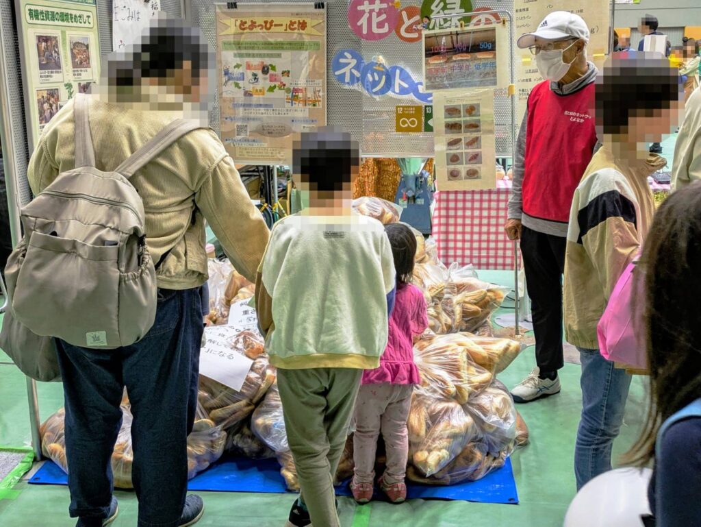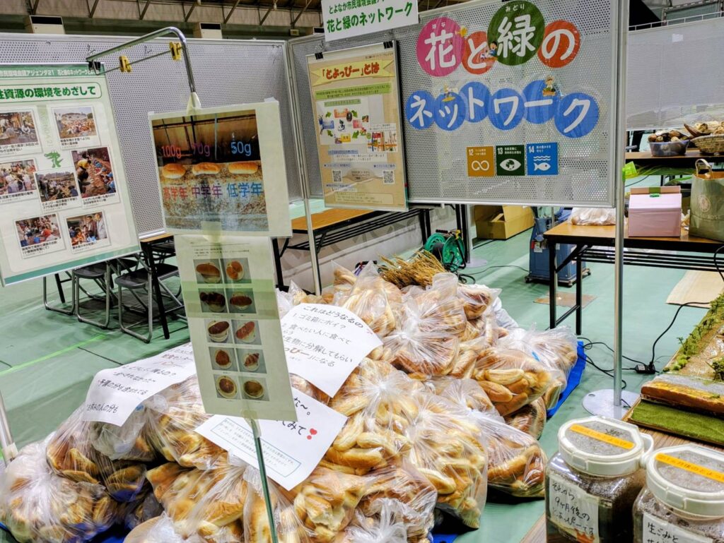 給食で食べ残した残パンを展示し、耳目を引く中で給食残渣類を資源循環堆肥「とよっぴー」を製造する活動を紹介、食べ物の大切さを訴えるとともに、堆肥を活用した様々で多様な活動を来場者に理解の促進に努めました。